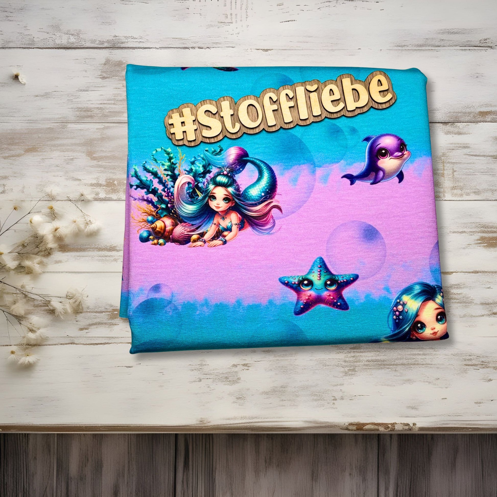 Dive into an enchanting underwater world: The fabric design "Underwater World" features delicate mermaids, playful seahorses, and floral details in harmonious colors. A dreamy children's fabric that enriches any sewing project with ocean magic and lightness.